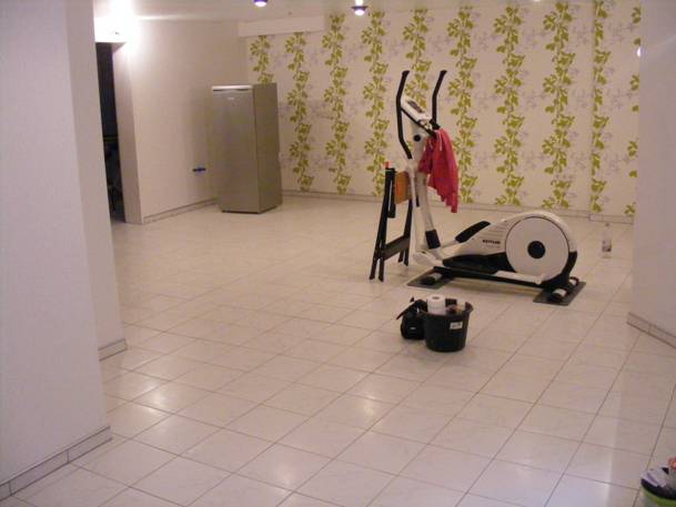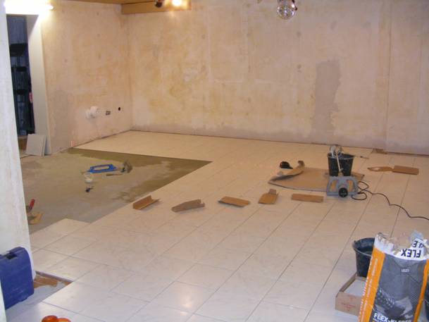 Hobbykeller: alte Fliesen zur Niveauanpassung der angrenzenden Räume weitläufig entfernen und entsprechend anspachteln. Auch hier Randfliesen selbst schneiden und mit Fliesenprofil (Oberkante) setzen |
